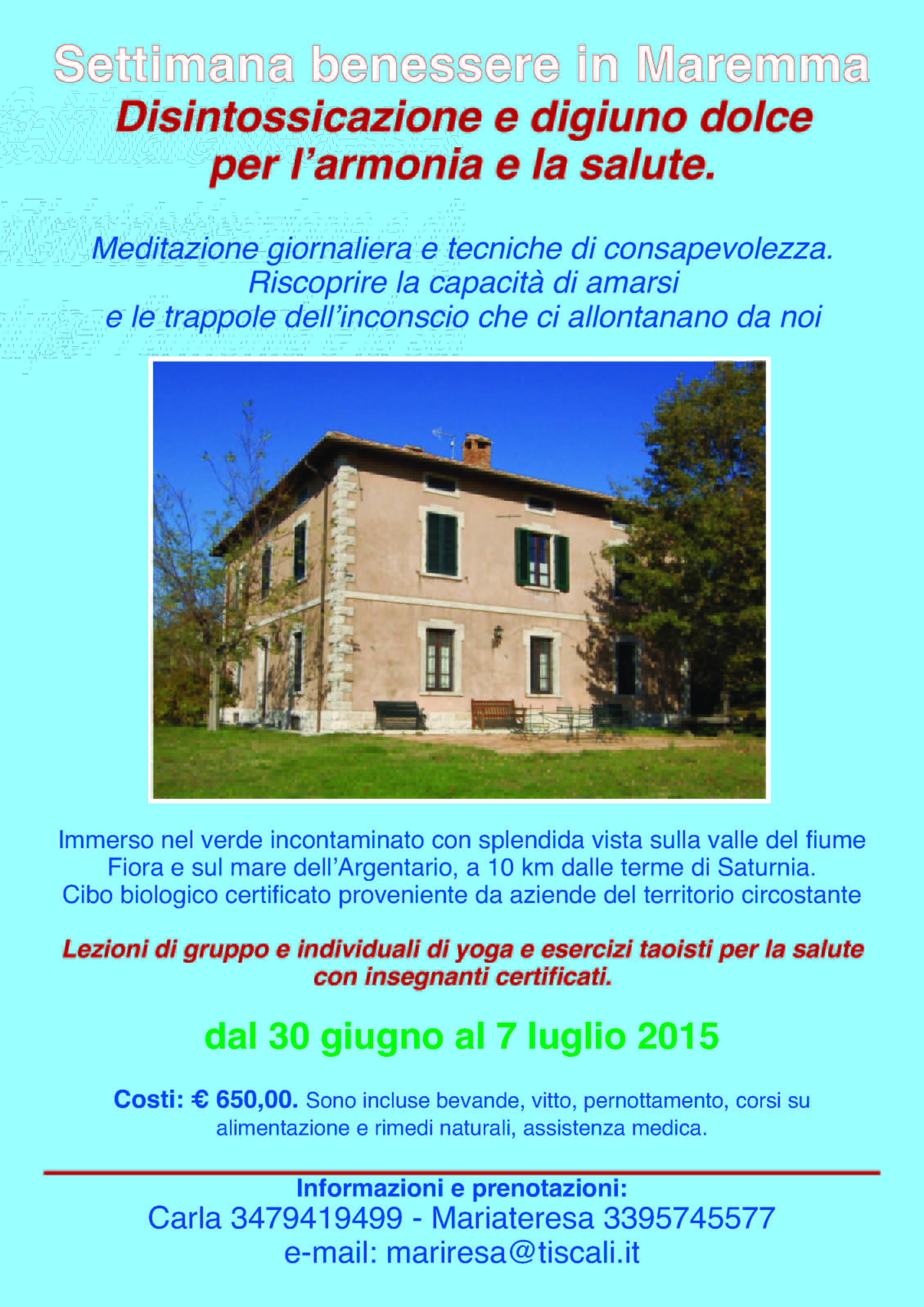 Settimana di digiuno dolce ed esercizi taoisti per ripulire gli organi, in Maremma vicino Saturnia dal 30 giugno al 7 luglio.