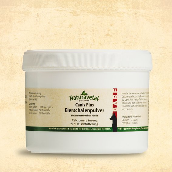 Come supplemento naturale di calcio all’alimentazione con la carne. Canis Extra Polvere di guscio d’uovo è un supplemento come fonte naturale di calcio durante l’alimentazione con le lattine di Canis Extra di pura carne, i rotoli di carne e come supplemento per l’alimentazione BARF. Cani, che non ricevono mai o mangiano raramente delle ossa, hanno bisogno di una fonte di calcio alternativa, per bilanciare il fosforo della carne. La nostra polvere di guscio d’uovo è molto fine per essere ben assorbita dall’organismo. Adatto anche per cani da allevamento. Canis Plus polvere di guscio d’uovo e Canis Plus Calce di alghe marine possono essere alternate come fonte di calcio. Basta mescolarle nel pasto di carne.