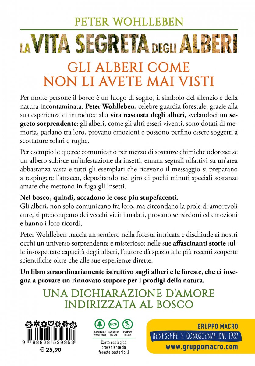 Per molte persone il bosco è un luogo di sogno, il simbolo del silenzio e della natura incontaminata. Peter Wohlleben, celebre guardia forestale, grazie alla sua esperienza ci introduce alla vita nascosta degli alberi, svelandoci un segreto sorprendente: gli alberi, come gli altri esseri viventi, sono dotati di me-moria, parlano tra loro, provano emozioni e possono perfino essere soggetti a scottature solari e rughe.